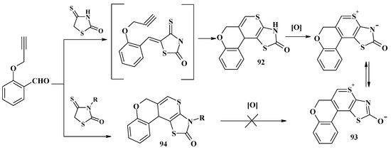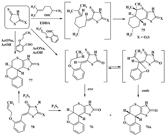 So, one of the examples of thiopyranothiazole scaffold synthesis is obtaining of series of chromeno[4′,3′:4,5]thiopyrano[2,3-d]thiazole-2-(thi)ones 76,77 and isothiochromeno[4a,4-d]thiazole-2-ones 75 in the domino Knoevenagel-hetero-Diels–Alder reaction (Scheme 26) of isorhodanine with 3,7-dimethyl-6-octenal ((±)citronelal) and 2-allyloxybenzaldehyde. It should be noted that the reaction of isorhodanine with 2-allyloxybenzaldehyde yielded a mixture of trans-76 and cis-76a isomers (5:1). The authors proposed a probable mechanism of this reaction through the exo-selective cyclization of the 5-arylidene intermediate in hetero-Diels-Alder reaction, while the formation of endo-intermediate is a minor process. Recrystallization from dioxane can provide individual trans isomer 76 [53]. Tetracyclic derivatives 76,77 were synthesized alternatively via the “domino” thionation-hetero-Diels-Alder reaction of 5-(2-allyloxyphenylmethylidene)-4-thiazolidinones 78 [54].