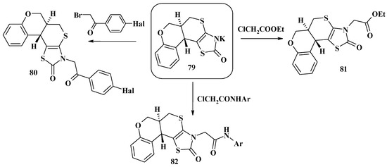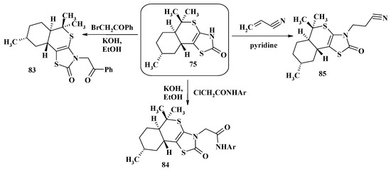 Using the same approach (Scheme 28), isothiochromeno[4a,4-d]thiazole-2-one 75 was alkylated by chloroacetamides, bromoacetophenones to give the derivatives 83,84. When it was treated with acrylonitrile, the cyanoethylation reaction resulted in propionitryl 85 formation [56].