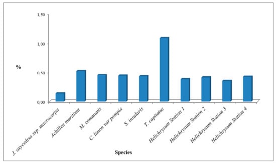 The essential oil samples were obtained from fresh materials by hydro-distillation for 4-5 h using a Clevenger-type apparatus. The extraction yield was calculated in mL of oil for 100 g of fresh material. The reached yields are reported in Figure 1.