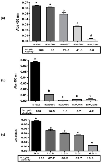 Lytic activity of modified hen egg white lysozyme (HEWL) by heat and chemical treatment. (a) Heat treatment HEWL at pH 6.0, native HEWL (N-HEWL), (b) heat treatment HEWL at pH 7.0, N-HEWL, and (c) HEWL treated with DTT for 0 h, 1.0 h, 2.0 h, and, 4.0 h of incubation. Data are expressed as the mean ± standard deviation (n = 3). Different letters present significant differences (p < 0.05) in ANOVA and Tukey’s test.