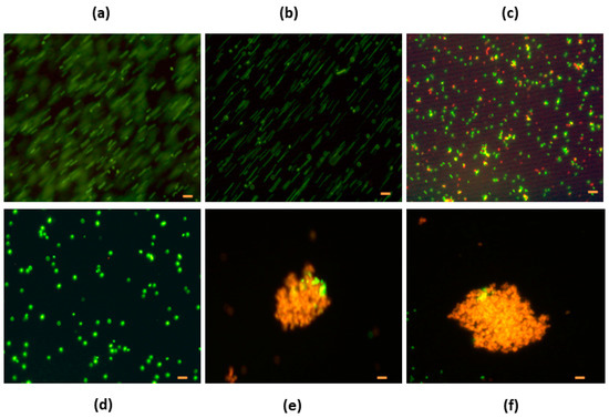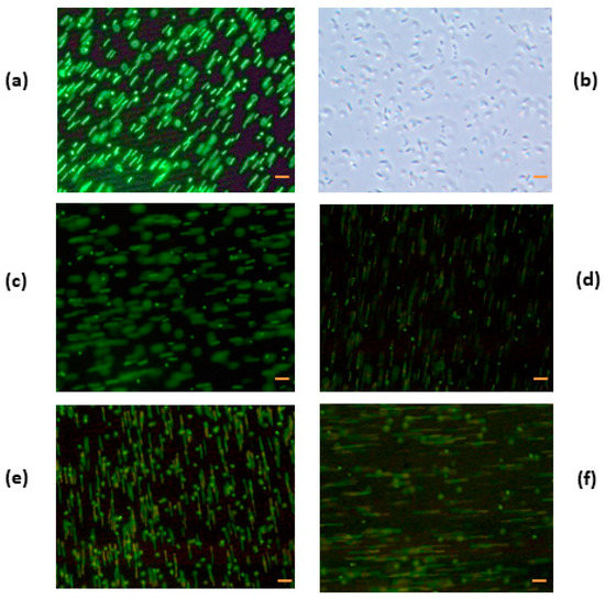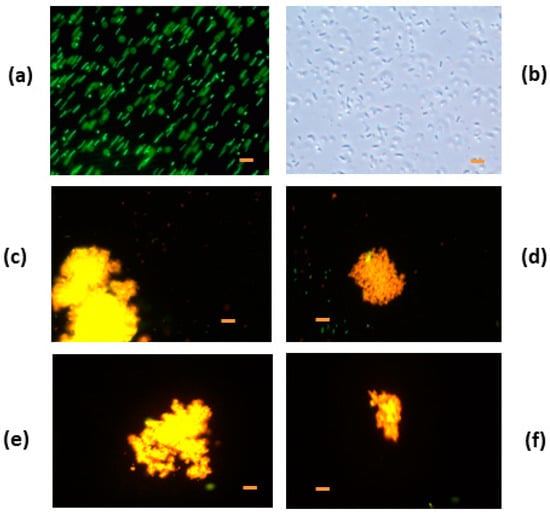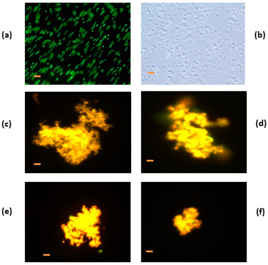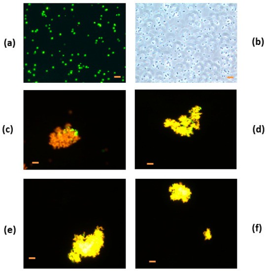 We observed green fluorescence in E. coli, the control bacteria without sample, and typical movements of bacteria (Figure 4a,b). HEWL/80 °C, HEWL/90 °C, HEWL/95 °C, and HEWL/120 °C at pH 6.0 showed cell aggregation and red-orange fluorescence (Figure 4b–f). For example, HEWL/80 °C at pH 6.0 and at a concentration of 0.5 mg/mL showed aggregation of cell bacteria (E. coli) with red fluorescence (Figure 4c). Red-orange fluorescence indicates damaged membranes with dead cells. Bacteria were different with respect to bacteria control and characteristic bacteria movement was absent, presenting a product aggregation as a result of the breaking membranes.