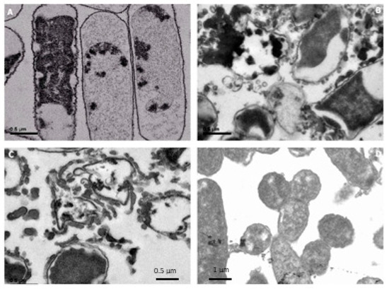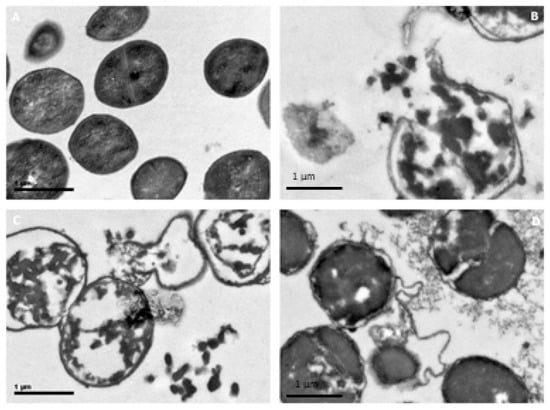 Electron microscopy was used to observe possible changes in cell morphology after incubation of E. coli and S. carnosus with modified HEWL. The bacteria control (E. coli without HEWL) had normal morphology of bacillus Gram-negative bacteria (Figure 8A). The outer membrane appeared normal under an electron microscope. E. coli incubated for 15 h with HEWL/90 °C pH 6.0 (0.5 mg/mL) showed different morphology with respect to the control bacteria. The outer membrane was broken, and cellular pieces were observed in the medium (Figure 8B). The cells were lysed with HEWL/90 °C at pH 6.0. The same situation was observed when E. coli was incubated with HEWL/120 °C at pH 6.0 (0.5 mg/mL) (Figure 8C). Pieces of bacteria were viewed in the medium product of lysis with heated HEWL. This same situation was observed with heated HEWL at pH 6.0 at different temperatures and different concentrations. The morphology of E. coli incubated for 15 h with HEWL/DTT (2.0 h) at 0.5 mg/mL was different compared with the control bacteria. A black cytoplasm was observed in the cells and white spaces (loss of cytoplasm) were seen under the electron microscope (Figure 8D). The same was noticed when E. coli was incubated with HEWL/DTT at different reduction times and concentrations of the assay. Gram-positive bacteria (S. carnosus with or without modified HEWL) were analyzed with an electron microscope. Control bacteria without HEWL are shown in Figure 9A.