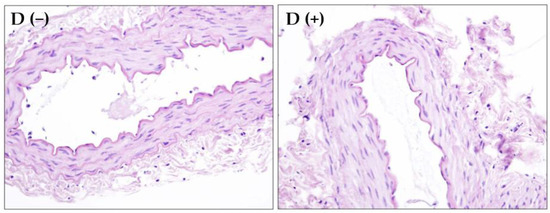 Rat femoral artery vascular rings with endothelium isolated from healthy (D −) and diabetic (D +) animals after hematoxylin and eosin staining (magnification 400×).