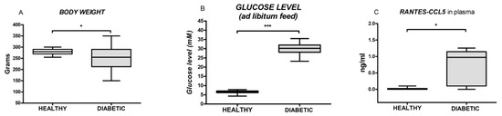 Box and whiskers plots showing body weight, the blood glucose level and the plasma level of RANTES-CCL5 in healthy and diabetic animals. The upper and the lower hinge of the boxes represent the interquartile range, the midline represents the median value, and the whiskers represent the maximum and minimum values. * p < 0.05, *** p < 0.001.