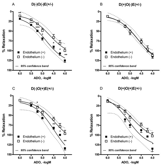 In a group of sham-operated animals, adenosine (1–100 µM) produced a comparable concentration-dependent relaxation of the femoral artery (irrespective of endothelial presence) if compared to non-operated (healthy) animals. Considering this, and in accordance with “the 3Rs” principle of avoiding the further unnecessary use of experimental animals [13,14,15], from this point, the control group consisted of only non-operated animals.