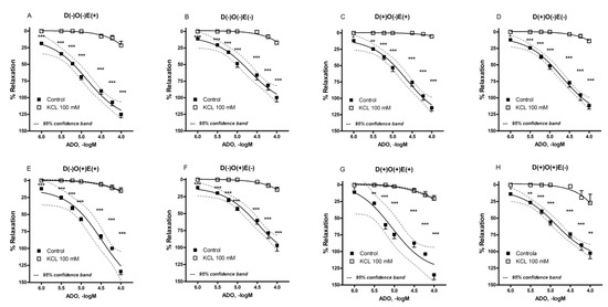 Adenosine-induced relaxation in isolated rat femoral artery in the presence of hyperpolarizing solution (KCl = 100 mM). The femoral artery was obtained from non-diabetic (A,B,E,F) and diabetic animals (C,D,G,H). Additionally, femoral artery was occluded in randomly selected non-diabetic (E,F) and diabetic animals (G,H). Each point is presented as the mean ± S.E.M (n = four to eight). Adenosine-induced vascular relaxation is expressed as the percentage of pre-contraction induced by phenylephrine. * p < 0.05, ** p < 0.01, *** p < 0.001. E = endothelium; D = diabetes; O = occlusion.