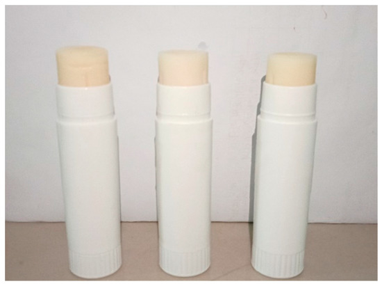 Balm sticks were made with three formulas with variations of Nigella sativa oil content (Table 1). BHT (butyl Hydroxytoluene) was dissolved in VCO (mass 1). Cera alba was melted on water bath at 65 °C and stirred (mass 2). Setil alcohol was added into mass 2, followed by adeps lanae and melted into a homogeneous mixture. The mixture was removed from the water bath, then added with mass 1 and stirred well. Finally, Nigella sativa oil was added and stirred to the homogeneous mixture, then formed into sticks (Figure 1).