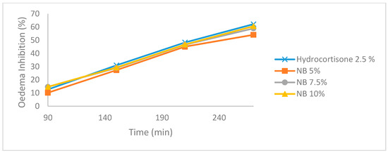 In this study, the acute anti-inflammatory activity test was carried out using the carrageenan-induced paw oedema method. Carraageenan caused inflammation by a mechanism involving phospholipase A2 and production of the inflammatory mediator such as cytokines, serotonin, histamine, prostaglandins and leukotrienes, which facilitate the migration of leukocytes to inflammatory sites [17,22]. Oedema occurs due to increased capillary permeability so that the flow of fluid rises continuously to the inflammatory tissue. At 0–1 h after injection of carrageenan, basophils and thrombocytes release of histamine and serotonin from the site of inflammation, therefore oedema was formed. The process of acute inflammation reaches the peak within 2–3 h after injection of carrageenan [23]. In this research, a Nigella contained balm stick has been proven to reduce oedema in carrageenan-induced paw. Table 2 showed a decrease in the percentage of oedema in all groups except control. Significant oedema inhibition of all NB groups starts at 150 min, which was around 28% and the total inhibition of oedema in the NB 10% group at 270 min was 60.64%. As seen in the result, the percentage of oedema in the NB group was 5%, 7.5%, and 10%, continued to decrease to 270 min drastically, and the oedema inhibition had the same trend as hydrocortisone (Figure 2).