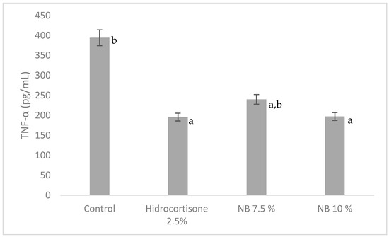 Granuloma pouch tissue of rats could also be used as an assessment of inflammation. Biochemistry observation of exudates was carried out on TNF-α levels. Test results showed 7.5% and 10 % NB groups could significantly reduce TNF-α levels (p < 0.05) (Figure 3), with reductions of around 39% (NB 7.5%) and 50% (NB 10%) compared to control. The NB 10% group was able to lower TNF-α levels comparable to 2.5% hydrocortisone.