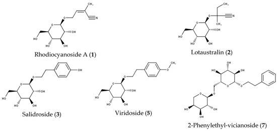 Structures of proposed cyanogenic glycosides (1, 2) and phenylethanoids (3, 5, 7).