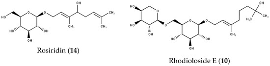 Two monoterpene alcohols were assigned as rhodioloside E (10), containing arabinopyranosyl-glucopyranoside, and rosiridin (14) containing glucopyranoside.