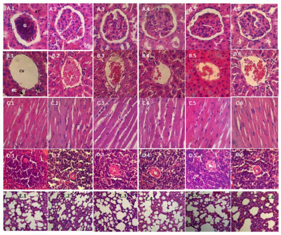 Histopathological examination (HE, 400×) of various organs of male rats in a subchronic oral toxicity study: (A–E) the kidney, liver, heart, spleen and lung, respectively; and (1–6) the control, satellite-control, the low, middle, and high dose groups, and the satellite-highest dose group (75 mg/kg bw), respectively. G, Glomerulus; KT, Kidney Tubules; CV, Central Vein; KC, Kupffer Cell.