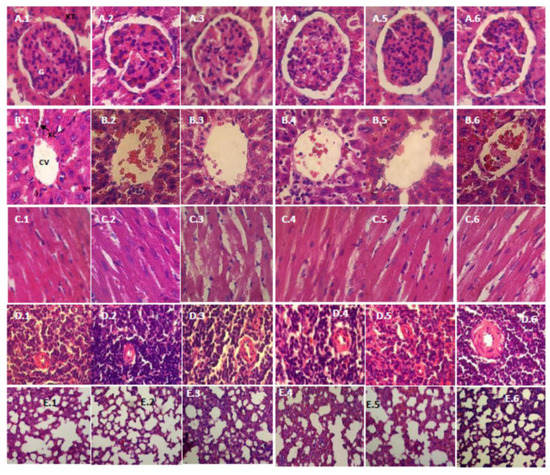 Histopathological examination (HE, 400×) of various organs of female rats in a subchronic oral toxicity study: (A–E) the kidney, liver, heart, spleen and lung, respectively; and (1–6) the control, satellite-control, the low, middle, and high dose groups, and the satellite-highest dose group (75 mg/kg bw), respectively. G, Glomerulus; KT, Kidney Tubules; CV, Central Vein; KC, Kupffer Cell.