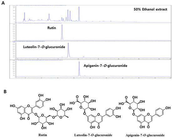High Performance Liquid Chromatography (HPLC) patterns of the main composition of Agrimonia pilosa Ledeb. extract and chemical structure of isolated compounds. (A) The HPLC chromatogram analysis of isolated compound by Sephadex LH-20. Condition, column: Agilent Edipse XDB-Phenyl 4.6 × 150 mm (3.5 μm), mobile phase: solvent A (0.1% trifluoroacetic acid) and solvent B (acetonitrile) in gradient mode, flow-rate: 0.7 mL/min, detection at 254 nm. (B) Chemical structure of isolated components from Agrimonia pilosa Ledeb.