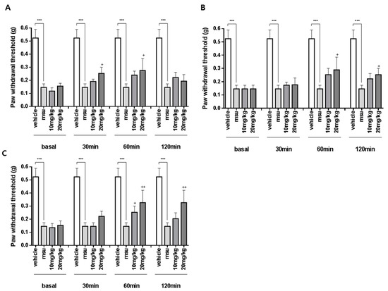 The antinociceptive effect of rutin, luteolin-7-O-glucuronide, and apigenin-7-O-glucuronide administered orally in MSU-induced pain model. Mice were administered orally with (A) rutin, (B) luteolin-7-O-glucuronide, or (C) apigenin-7-O-glucuronide (10 or 20 mg/kg) and the pain thresholds were measured at 30, 60, and 120 min after treatment using Von-Frey test. The vertical bars denote the standard error of the mean. n = 5 per group. (A) *** p < 0.001 (vehicle vs. MSU), + p < 0.05 (MSU vs. 20 mg/kg). (B) *** p < 0.001 (vehicle vs. MSU), + p < 0.05 (MSU vs. 20 mg/kg). (C) *** p < 0.001 (vehicle vs. MSU), + p < 0.05 (MSU vs. 10 mg/kg), ++ p < 0.01 (MSU vs. 20 mg/kg).