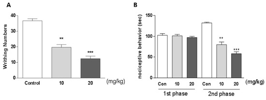 Interestingly, we examined the analgesic effect of aspirin and acetaminophen in a previous study, when the potency was compared, apigenin-7-O-glucuronide showed a better potency compared to that of aspirin and acetaminophen. In our previous study, aspirin or acetaminophen at doses of 200 and 300 mg/kg significantly attenuated pain behavior induced by TNF-α, IL-1β, or IFN-γ administered intrathecally [32]. However, in the present study, apigenin-7-O-glucuronide reduced antinociception in acetic acid and formalin-induced inflammatory models only at doses of 10 and 20 mg/kg. Based upon these results, apigenin-7-O-glucuronide isolated from AP may be applied as an effective analgesic drug.