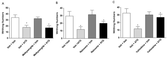 Effect of methysergide (A), yohimbine, (B) and naloxone (C) pretreated intrathecally (i.t.) on inhibition of the antinociception induced by apigenin-7-O-glucuronidein the writhing test. Methysergide, yohimbine, or naloxone (0.01 μg/5 μL) was pretreated i.t. for 5 min. Mice were administered orally with apigenin-7-O-glucuronide (20 mg/kg) for 30 min prior to the i.p. injection with 1% acetic acid. The number of writhing was counted for 30 min following acetic acid injection. The vertical bars indicate the standard error of the mean. n = 8–10 per group (* p < 0.05, compared with control group).