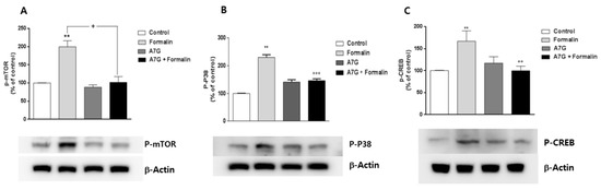 Spinal expression of mTOR, P38, or CREB protein phosphorylation was evaluated by western blotting. The lumbar spinal cord was dissected at 20 min after formalin injection. Formalin injection caused upregulation of p-mTOR, p-P38, and p-CREB expression in the spinal cord. In addition, oral administration with apigenin-7-O-glucuronide (20 mg/kg) attenuated formalin-induced p-CREB, p-P38, and p-mTOR levels (Figure 5).