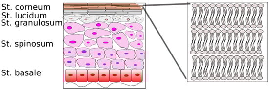 The skin is the largest organ of the human body and has a surface area of about 2 m2 in healthy grown-ups [5]. The human skin is a complex organ that acts as the first protecting barrier of the body. The clarification of skin structure, mainly in relation to its barrier function, has been studied by many researchers since the 1960s [6,7,8,9,10]. It is a multilayer tissue, and its main function is to guard the body against external circumstances by functioning as an effective barrier to the absorption of exogenous particles [11,12,13]. The skin is an important target as well as a main barrier for dermal drug delivery [14].