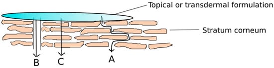 There are three different pathways allowing substances to pass through the cutaneous barrier [18]. There are three major routes of penetration for the passive diffusion of a molecule across the SC (Figure 2). The first pathway is the intercellular penetration pathway, which has come to be the most important one for many years. Approximately 15 years ago, the follicular penetration pathway was also found to be a second essential pathway. The transcellular penetration pathway, where the materials pass through both the corneocytes and the lipid layers, seems to be unimportant at present [16,19].