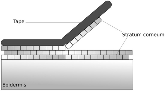Tape stripping is a commonly used, minimally invasive method for testing the penetration of topically applied formulations through the stratum corneum, whereby layers of the stratum corneum are removed by an adhesive tape and skin layers residing on the adhesive tape are examined (Figure 9). On the one hand, the protein content of the different layers can be determined by the method, and on the other hand—after the topical application of the composition to be tested—the amount of the active ingredient in the selected layer can be determined. In addition to drug penetration testing, the effect of the substance on skin hydration and skin proteins can be observed, e.g., to modify the secondary structure of keratin. Tape stripping can also be used in vitro and in vivo on human and animal skin, as well as on appropriate skin models [15,25,80]. The Organization for Economic Co-operation and Development Test Guideline (OECD TG) 427 describes the use of tape stripping for the removal of upper skin layers and the in vivo penetration of active substances [31], while the OECD TG 428 has been performed with the in vitro application of the method for experiments [32].