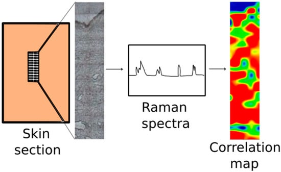 Permeation through the skin can be explored by chemical mapping (Figure 10). Chemical mapping is one of the methods of vibration spectrometry; the suitable test apparatus is a vibration spectrometer (e.g., Raman) and a suitable optical unit (e.g., microscope). Raman Spectrometry is highly selective, with a fingerprint spectrum that allows clear molecular identification. The irradiating light can be focused on a very small point (~1 µm2) with a suitable microscope lens, so reliable chemical information can also be obtained from a microscopic area of the sample. The spatial distribution of the fundamental components of the sample can be determined by the spectra that make up the map. Chemical maps contain a huge quantity of data. Although these can be controlled by methods commonly used in spectroscopy, the huge amount of data can be utilized more efficiently by using appropriate mathematical (multivariate data analysis) techniques. Thanks to these advantages, the technology has enormous potential in various applications: From the analysis of the distribution of the physiological components of the skin and tissues through the diagnosis of pathological conditions to biopharmaceutical studies, such as drug penetration kinetics [15,25,120,121]. Table 6 summarizes the most important recent results.