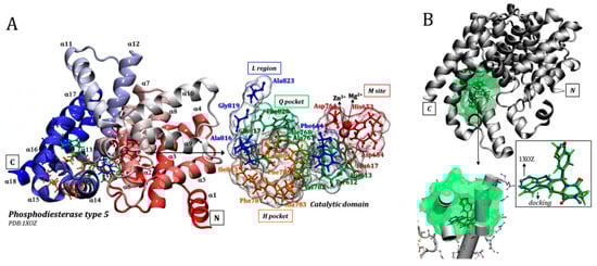 Details of the three-dimensional structure of the phosphodiesterase type 5 (PDE5) enzyme: (A) highlighting some amino acid residues that make up the catalytic domain and (B) comparative redocking of the conformational arrangements of the tadalafil inhibitor in the crystallographic structure (in grey) and using the molecular docking protocol (highlighted in green).