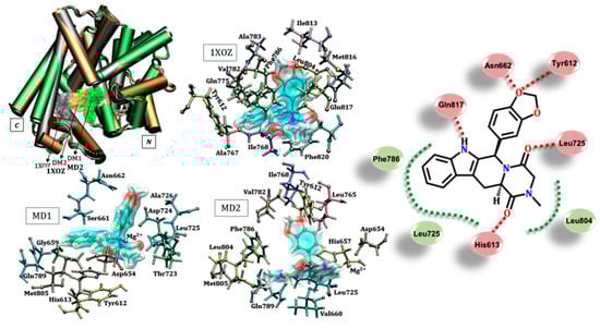 Stabilization of the inhibitors in the catalytic domain can be understood from the different forms of protein–ligand interaction. Such intermolecular interactions can be observed by the “contact” between the inhibitory molecules with the different side chains or backbone of specific residues. Some of these specific interactions for tadalafil are detailed in Figure 2 (also shown in Figure S3), which shows a set of possibilities for protein–inhibitor interactions considering the different protein structures used in molecular docking. An important interaction known to stabilize the inhibitor tadalafil is the hydrogen bonding performed with Gln817 [,,], as identified in the 1XOZ structure via redocking. Moreover, this glutamine was previously studied by our research group, wherein the quantitative importance of H-bonds to stabilize tadalafil was identified []. On the other hand, based on MD structures, different residues may also stabilize tadalafil. This may occur through polar interactions, which may be oriented sufficiently to form hydrogen bonds with residues Leu725 (backbone amine), Asn662, His613 and Tyr612, or there are possible hydrophobic interactions with Leu725, Leu804 and Phe786.