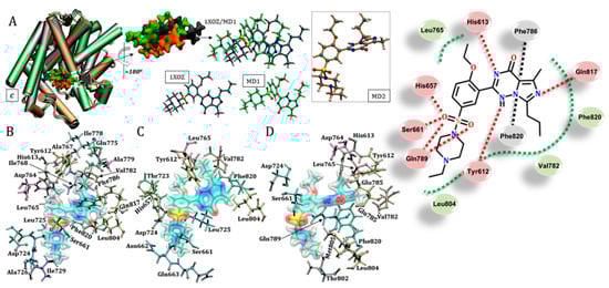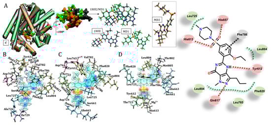 Positions of the vardenafil ligand obtained for the three protein structures studied. (A) shows the position similarity obtained for vardenafil in the 1XOZ and MD1 structures. (B) Shows the residues in the crystallographic structure that stabilize the ligand, while (C) and (D) show the residues responsible for inhibitor stabilization in the catalytic site considering structures MD1 and MD2, respectively. Residues were r ≤ 3.0 Å from the ligand. Legend of interactions, red: hydrogen bond (and dipole–dipole); green: hydrophobic; black: π-stacking.
