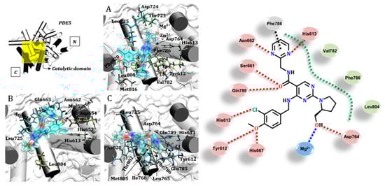 Inhibitors of PDE5 have gained prominence in the scientific field with advances in understanding the physiological functions of the PDE5 enzyme [,,]. Specifically, such inhibitors were originally synthesized for treatment of hypertension, pulmonary hypertension, coronary heart disease and angina []. However, later inhibitors emerged as an interesting indication for erectile dysfunction, because the expression of PDE5 is more abundant in the human corpus cavernosum compared to other tissues. This is an important factor because it is considered to be the main reason for the clinical efficacy of these inhibitors [,]. All PDE5 inhibitors share similarities and they compete for active site binding with cGMP. In general, they act to inhibit PDE5 by blocking cGMP binding at the catalytic site, thus preventing the hydrolysis of cGMP to guanosine monophosphate [,]. Currently, sildenafil, tadalafil and vardenafil are the most common drugs for the treatment of erectile dysfunction approved by the Food and Drug Administration (FDA) []. Despite the drugs’ efficiency, some PDE5 inhibitors have collateral effects which include headache and nasal congestion. The effects are due to the dilation of arterial vessels, as well as non-selective inhibition of PDE1 which also hydrolyzes cGMP and is located predominantly in vascular smooth muscle cells [,]. In addition, PDE5 inhibitors are not only correlated with erectile dysfunction therapy; for example, tadalafil has recently been approved for the treatment of benign prostatic hyperplasia, pulmonary hypertension and lower urinary tract symptoms [,,], and recent studies have pointed to PDE5 inhibitors as a new strategy for the treatment of certain types of tumors [], demonstrating the importance of these compounds []. Researchers have investigated the correlation of important residues in PDE5 with the selectivity of these ligands [], which directly impacts the therapeutic applications of the aforementioned drugs. It has been reported that overexpression of PDE5 occurs in many carcinomas, including prostate [], mamma [], and colon (adenocarcinomas), as well as in cancer in lung cells and chronic lymphocytic leukemia cells [,]. In this sense, the use of PDE5 inhibitors has motivated work that investigates the chemopreventive mechanisms of such agents []. This is a strong motivator to better understand the interactions of drugs with the enzyme catalytic pocket and consequently to help in the development of novel PDE5 inhibitors with greater selectivity for novel therapeutic targets [].