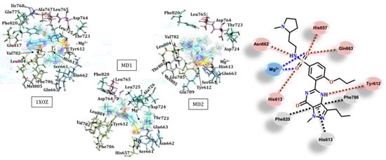 The udenafil inhibitor showed important interactions from its benzenesulfonamide group. As depicted in Figure 5, for instance, it is possible to observe metal–ligand interactions with the magnesium ion in the crystallographic structure 1XOZ, in addition to the dipole–dipole bond with the imidazole ring of His613 (details in Figure S6). In the structures extracted from MD simulations, there are interactions that suggest hydrogen bonds of the benzenesulfonamide group with the imidazole ring of His657 (MD1) and amine groups of Gln663 and Gln789 (MD2), as well as with the hydroxyl in the side chain of Ser661. According to these interactions, the amino acid residues acted as donors in the hydrogen bond and udenafil was a preferential acceptor. Asn662 also acted as a donor in its hydrogen bonding with the sulfonamide nitrogen of the inhibitor. On the other side of the catalytic site, the Tyr612 residue acted as a receptor when it interacted with the pyrimidine ring of udenafil. Besides polar interactions, hydrophobic and π-stacking intermolecular bindings were observed between the aromatic rings of Phe820, Phe786 and His613. Although udenafil is the most bulky inhibitor when docked, the set of residues that stabilize it are also observed for the other inhibitors of PDE5, as summarized in Figure 5 [,,].