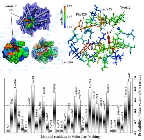 The commercial drugs available for phosphodiesterase type 5 inhibition have singularities in their structures which affect their stabilization via several residues in the catalytic domain. The contribution of PDE5–ligand interactions is reflected in the experimental results of inhibitory activity, for instance IC50: avanafil 1 nM; sildenafil 3.7 nM; tadalafil 1.8 nM; udenafil 8.2 nM and vardenafil 0.09 nM []. Despite vardenafil having the highest potency among the other drugs studied here, the selectivity of this compound still requires study. Adverse effects are also directly related to the potency of vardenafil and, due to its action in other phosphodiesterases, are a concern []. Considering only the action at the PDE5 catalytic domain, a general mechanism for PDE5 inhibition suggests an interaction which avoids the hydrolysis of cGMP to GMP, and there are specific residues essential for the binding of cGMP, as well as inhibitors []. The results discussed here present a pattern of interactions within the catalytic pocket of PDE5, with some residues being highly versatile, assuming different conformations and interactions to better stabilize the ligands in this region. The frequency of observation of these residues is presented as probabilities in Figure 7, which shows the importance of each component in the docking of the commercial drugs evaluated. Residues such as Tyr612, Leu725, Leu804 and Phe820 were frequently found close to the ligands (r ≤ 3.0 Å). In fact, Tyr612 has been described in the literature as important for increasing the affinity of vardenafil compared to tadalafil [], as indicated in the present study. Other residues also showed a high probability of being found in “contact” with the PDE5 inhibitors, including Phe786, Val782, Leu765, Asp764, Asp724, Thr723, Ser661 and His613, as well as the magnesium ion. It is important to highlight that amino acid residues with hydrophobic side chains do not necessarily form only non-polar interactions with the inhibitors; they can use the backbone carbonyl (or amine) to form polar interactions, even with well-directed hydrogen bonds [] (according the probabilities depicted in Figure 7).
