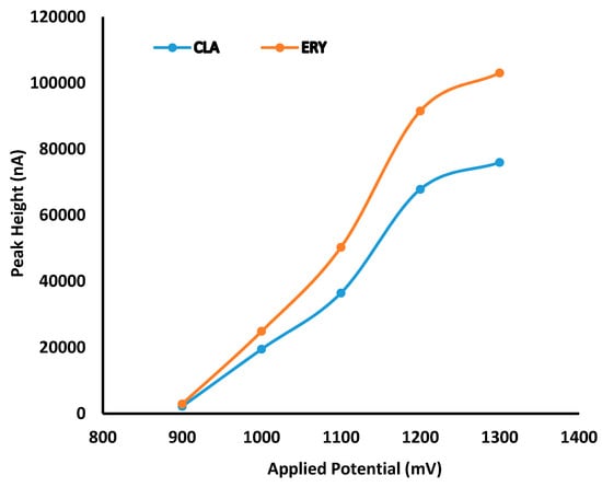 Hydrodynamic voltammetric (HDV) studies were undertaken to identify the optimum working electrode potential for the analysis of CLA. The HDV of CLA and ERY generated in direct current (DC) mode at potential settings ranging between +900 mV and +1300 mV at a scan background current of 100 nA is depicted in Figure 2.