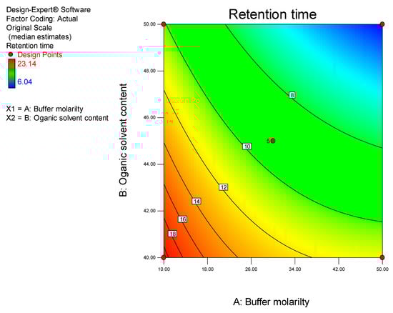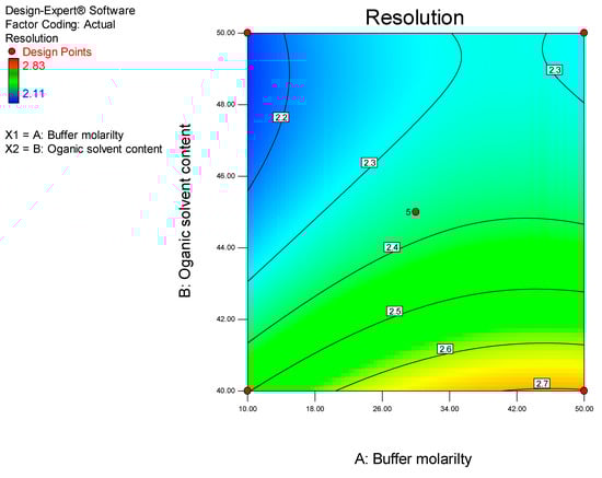 ANOVA analysis reveals that the model for peak resolution was significant (p < 0.0001). The significant model terms were buffer molarity and ACN content with p values of 0.0028 and <0.0001, respectively. The two-dimensional contour plot of the influence of the two factors on peak resolution is depicted in Figure 7.