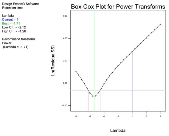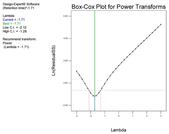 Examination of the model Box-Cox plot (Figure 4) inferred the need to transform the model. The plot reveals that the blue line fell outside the 95% confidence interval, indicating that the model was not located in the optimum region of the parabola. Consequently, a power transformation of the model was undertaken using model reduction by backward elimination in order to improve the fit of the data to the model, thereby permitting navigation of the design space [].
