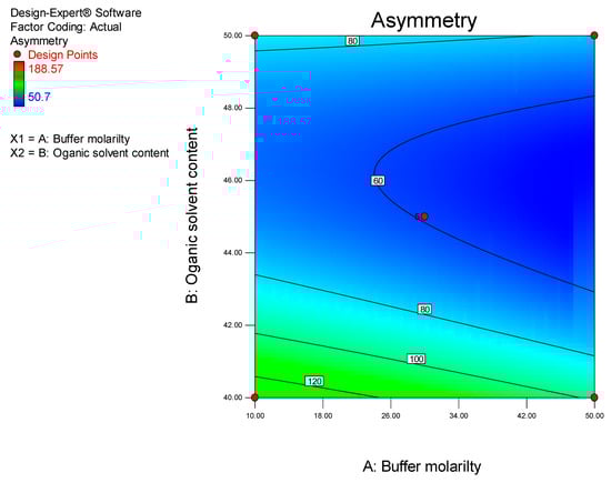 Contour plot depicting the impact of ACN content and buffer molarity on peak asymmetry.