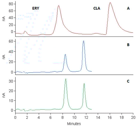 - Kees, F.; Spangler, S.; Wellenhofer, M. Determination of macrolides in biological matrices by high-performance liquid chromatography with electrochemical detection. J. Chromatogr. A 1998, 812, 287–293. [Google Scholar] [CrossRef]