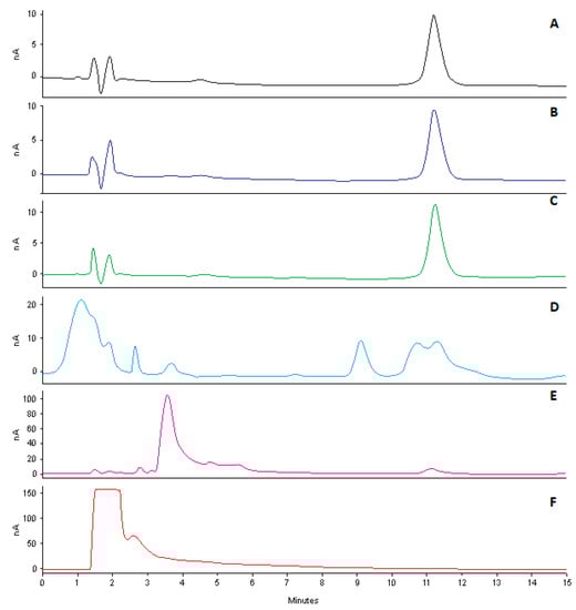 Typical chromatograms following degradation of CLA (10 µg/mL) following exposure to ACN (A), heat at 80 °C (B), 500 W/m2 UV radiation (C), 0.1M HCl (D), 0.1M NaOH (E) and 4% v/v H2O2 (F).