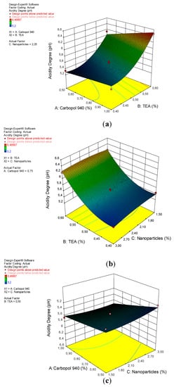 A 3D plot of the relationship between (a) carbopol 940 and TEA and the acidity degree, (b) TEA and nanoparticles and the acidity degree, and (c) carbopol 940 and nanoparticles and the acidity degree.