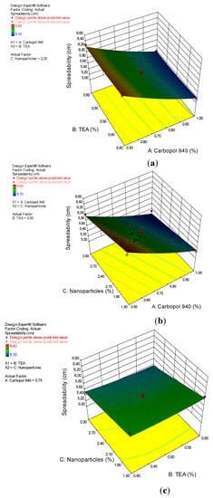 3D plot of the relationship between (a) carbopol 940 and TEA and the spreadability, (b) carbopol 940 and nanoparticles and the spreadability, and (c) TEA and nanoparticles and the spreadability.