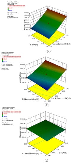 A 3D plot of the relationship between (a) carbopol 940 and TEA and the viscosity, (b) carbopol 940 and nanoparticles and the viscosity, and (c) TEA and nanoparticles and the viscosity.