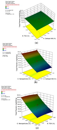 A 3D plot of the relationship between (a) carbopol 940 and TEA and the total phenolic content, (b) carbopol 940 and nanoparticles and the total phenolic content, and (c) TEA and nanoparticles and the total phenolic content.
