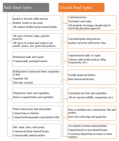 Three ml blood sample was collected from each patient to be used for clinical laboratory tests before cyclosporine administration (baseline) and then after 2 months of continuous drug intake. These tests were; triglyceride (TG), total cholesterol (TC), aspartate transaminase (AST), alanine transaminase (ALT), bilirubin, serum creatinine, blood urea, uric acid, potassium (K), and magnesium (Mg). Systolic and diastolic blood pressure were also measured for each patient before drug intake (baseline) and then after two months of continuous drug administration. The patients were given Neoral® (NEO, Novartis) oral solution containing 100 mg of cyclosporine/mL twice daily in a dose of 3 mg/kg/day according to the in-house protocol applied in the TDM center of Baghdad Teaching Hospital in Iraq. Concurrent food intake during cyclosporine therapy was carefully controlled by giving each patient a list of the types of food which are safe and can be taken and those which are unsafe and should be avoided as described in Figure 1. Biochemical changes and observed adverse effects associated with cyclosporine therapy were registered for each patient during the study.