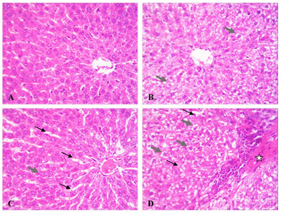 Figure 1. Effect of morphine (MOR) on liver microscopic picture in cisplatin (CP)-challenged rats. Rat liver photomicrographs (400×) showing microscopic specimens from control (A), MOR-treated group (B), CP-treated group MOR (C), and MOR/CP-treated group (D). Grey thick arrow, vacuolated hepatocyte; black thin arrow, dilated liver sinusoids; star, necrotic hepatic tissue. Semi-quantitative scoring of liver damage is presented in Table 3.