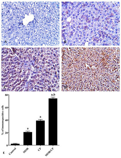 Microscopically, the liver in the control showed normal hepatic architecture (Figure 1A). On the other hand, the liver microscopic picture of MOR-treated group had large areas of enlarged vacuolated hepatocytes (Figure 1B), while that of the CP-treated group mostly showed dilated liver sinusoids with sporadic necrotic areas (Figure 1C). The histopathologic picture of the liver in the combined MOR/CP-treated group showed even more profound injuries than either treatment alone (Figure 1D). The results were semi-quantitatively scored to confirm these findings (Table 3). For caspase 3, the control group showed minimal background expression of the apoptotic marker (Figure 2A). On the other hand, either MOR or CP treatments alone caused up-regulation of caspase 3 expression by 9- or 17-folds higher levels (Figure 2B,C), respectively, compared to control. The combined treatment of MOR/CP caused synergistic up-regulation of about 34-folds of the control (Figure 2D) which was significantly different compared to CP alone, as evident by the semi-quantitative analysis performed (Figure 2E).