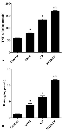 Figure 3. Effect of morphine (MOR) on liver tissue (A) TNF-α and (B) IL-6 in cisplatin (CP)-challenged rats. Data from 10 rats (n = 3) presented as means ± S.E.M. Results were reported having significant difference if p value was less than 0.05. a Significantly different compared to control, b significantly different compared to CP group.