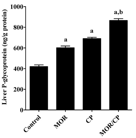 To investigate the effect of MOR on hepatic inflammation, the level of the pro-inflammatory cytokines TNF-α and IL-6 were tested in liver homogenate (Figure 3A,B, respectively), and it was found that the treatment with either MOR or CP caused significant increase in both markers compared to control. The effect of the combined treatment was even more pronounced and caused significant increase of both cytokines compared to the treatment with CP alone. Similarly, the level of the efflux transporter P-gp in the liver showed a significant increase after treatment with either MOR or CP to reach about 46% or 67% higher levels compared to control (Figure 4). The combined effect of MOR and CP caused almost additive increase in liver P-gp of about 110% compared to control, which was significant from the group treated with CP alone.