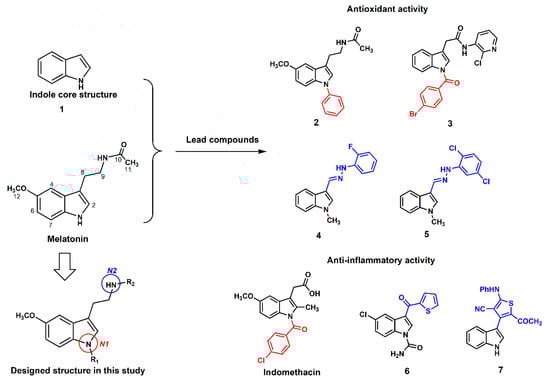 The rationale for designing the MLT derivatives in this study was retrieved from previous studies of the structure–activity relationship (SAR) of MLT (Figure 1). SAR studies revealed that the indole-core structure (1) and 5-methoxy substituted group play a crucial role in its antioxidative properties []. The lipophilicity via substitution bulky aromatic at N-indole (N1) (2) improved the antioxidant activity of MLT as shown by thiobarbituric acid reactive substances (TBARS) assay and an acetylated MLT derivative has been reported by our group to be a neuroprotective candidate [,]. A 4-bromobenzoyl substituted N1-indole derivative (3) was shown to be the most active compound in superoxide anion and lipid peroxidation inhibitory assays []. In addition, indomethacin, a well-known anti-inflammatory drug, presented 5-methoxyindole core substituted with 4-chlorobenzoyl group at N1-position, and it was also used as a prototype for new selective cyclooxygenase-2 (COX-2) inhibitors []. Turning to the modification at N2-position, hydrazide indole derivatives with halogenated aromatic side chain (4 and 5) also presented higher antioxidant activities than MLT []. Besides amide and hydrazide groups addition, indole derivatives with lipophilic 3-substituent (6 and 7) were designed to mimic the action of anti-inflammatory and analgesic drugs []. Therefore, lipophilic MLT derivatives were decided and synthesized in this study. We hypothesized that these derivatives, with lipophilic substitution at N1 or N2 positions of MLT, would show enhanced antioxidative activities. The scavenging potentials were screened by X-band ESR and then comparatively evaluated by in vitro antioxidant assays such as hydroxyl radicals scavenging test, oxygen radical absorbance capacity (ORAC), 2,2′-azinobis(3-ethylbenzothiazoline-6-sulfonic acid) disodium salt (ABTS) and ferric reducing antioxidant power (FRAP) assays.