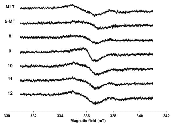 The MLT derivatives presented similar ESR patterns when compared with MLT and 5-MT spectra (Figure 2). Derivatives 9–12, which are aromatic substituent derivatives, had a higher response than their parent compounds; however, 8 had a lower intensity. The spectral pattern for 9 differed from others, which suggested that the location of the unpaired electron in 9 differed from others. These phenomena indicated that derivatives 9–12 would become their radical forms more readily than MLT and 5-MT.