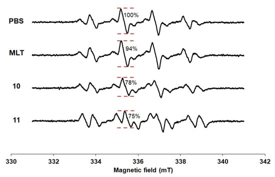 The spectra of DMPO spin trapping of hydroxyl radicals were presented in Figure 3. The DMPO-OH adduct was easily distinguished by a typical 4-line spectrum with the relative intensity ratio 1:2:2:1 due to the equivalent hyperfine splitting constants []. Although MLT is the powerful antioxidant, it slightly inhibited the Fenton reaction at concentration of 25 µM compared with PBS. The relative attenuation of the ESR signal amplitude of MLT was 6.19%. From previous report [], the biphasic pattern of MLT scavenging activity was found. At low concentration (1 µM) and high concentration (500–1000 µM) had higher effect, whereas lower effect presented in between concentration (10–100 µM) in H2O2-induced membrane lipid peroxidation experiment. At the same concentration, compounds 10 and 11 showed the lowest intensity among other derivatives with the relative attenuation of the ESR signal amplitude were 22.12% and 24.78%, respectively. Substitution with 4-bromobenzoyl and naphthoyl groups at N1-position (10 and 11) obtained compounds with a stronger hydroxyl radical inhibitory effect than MLT.